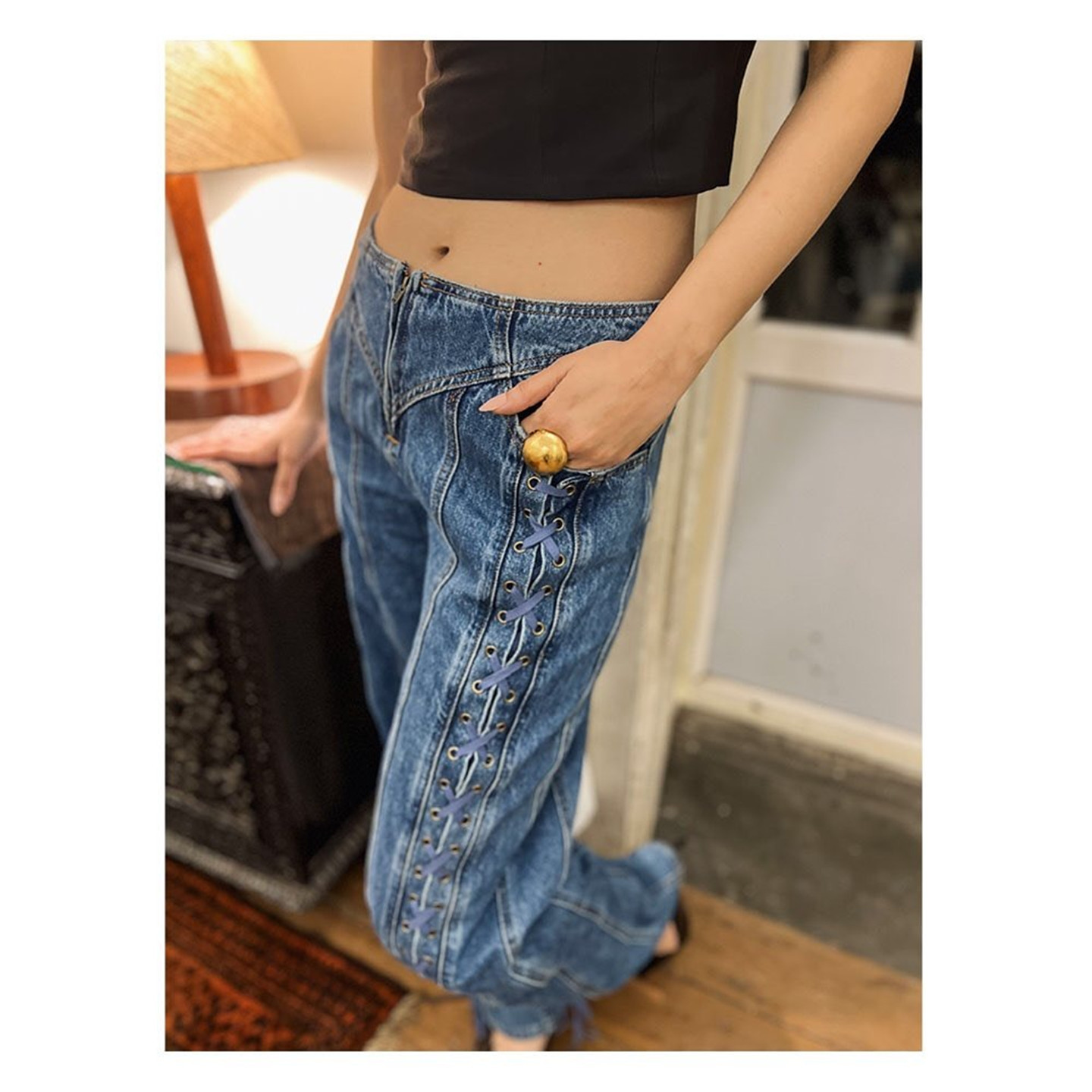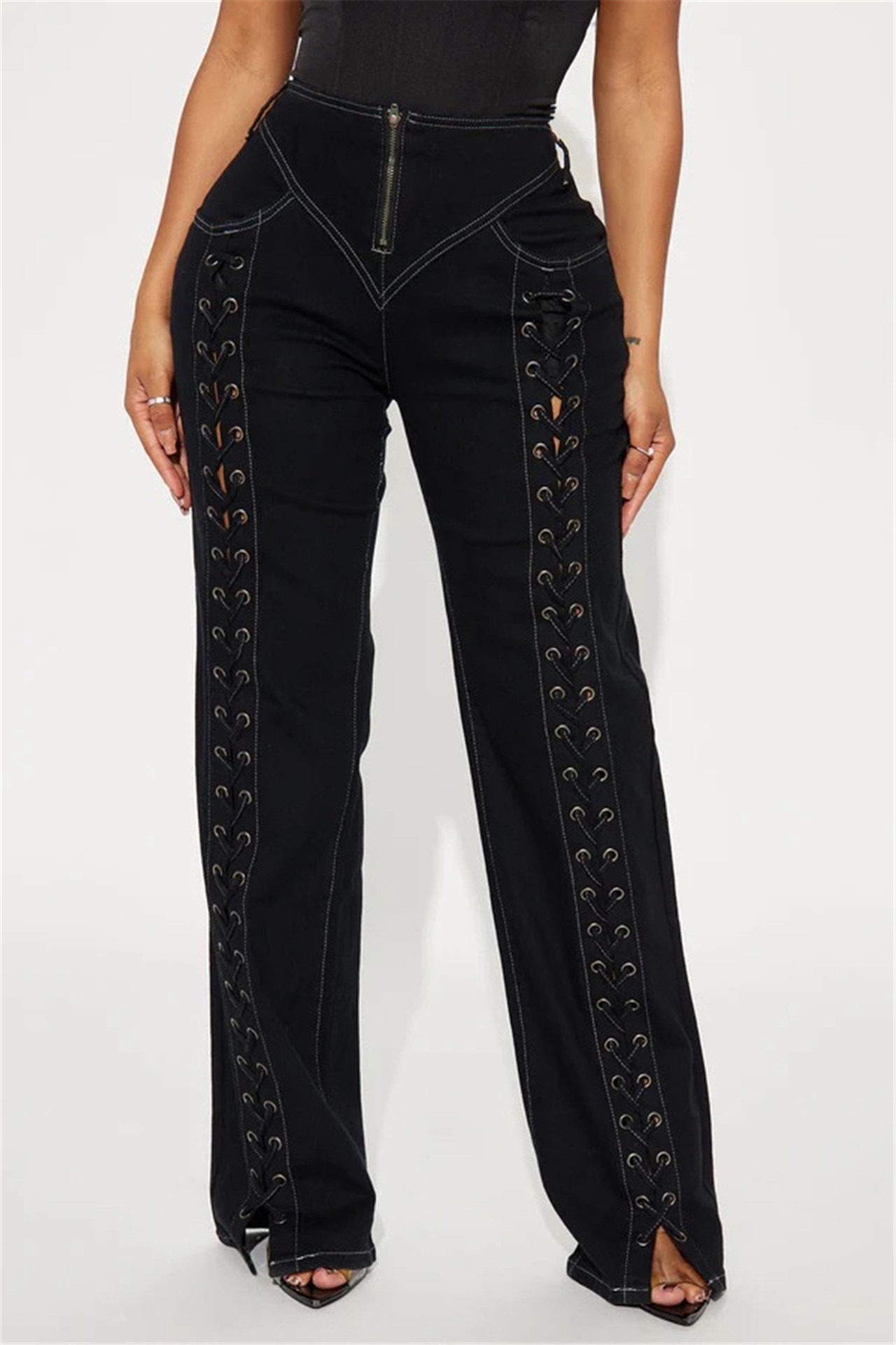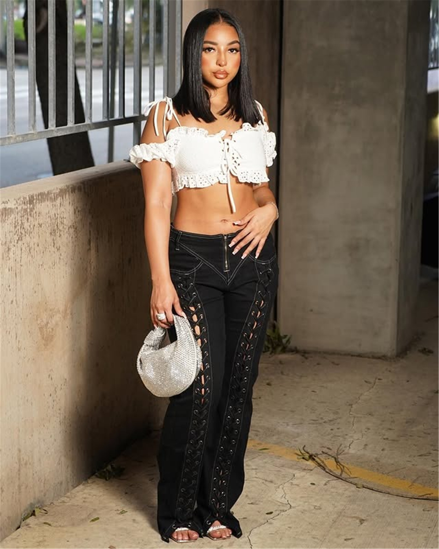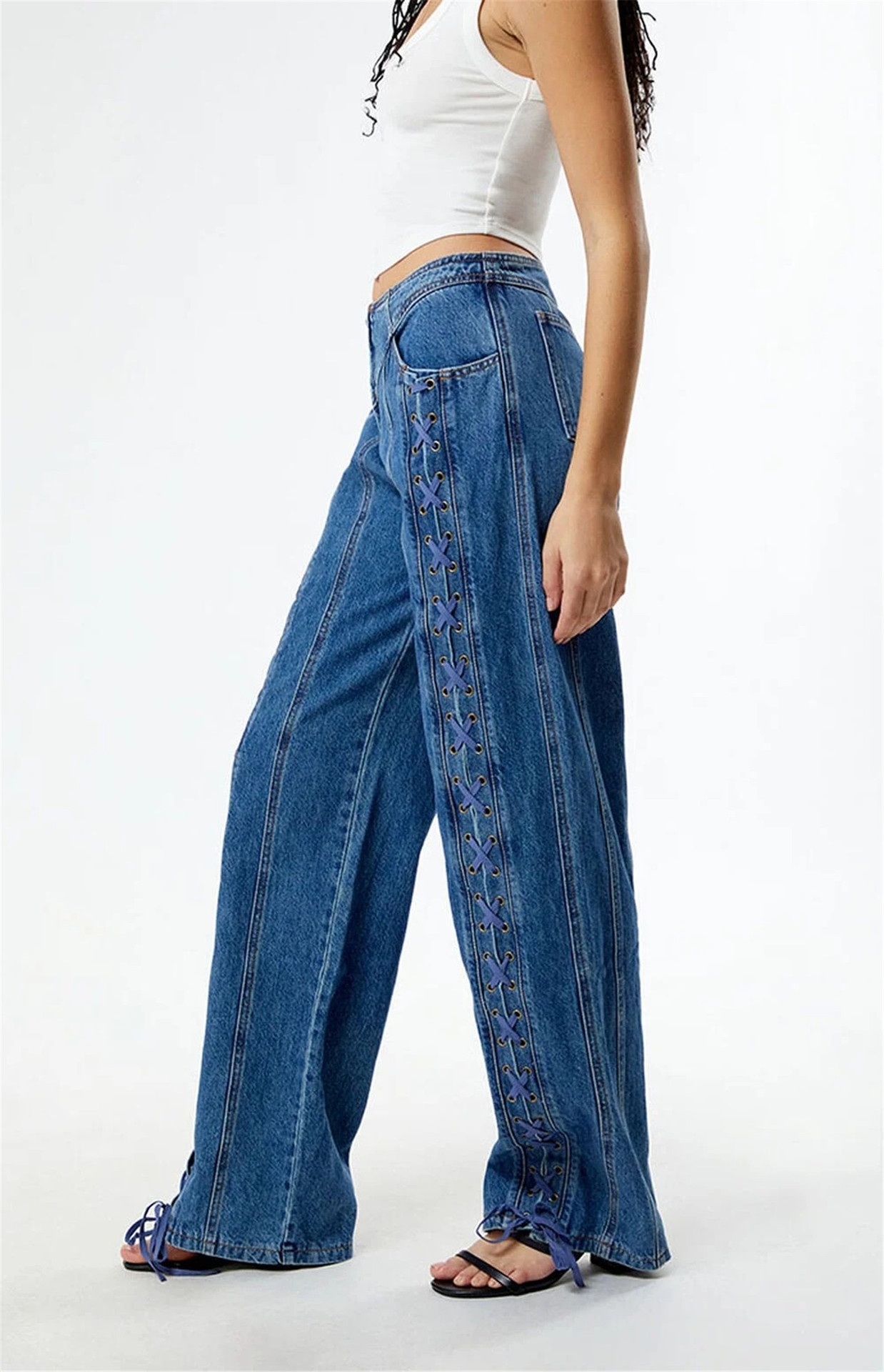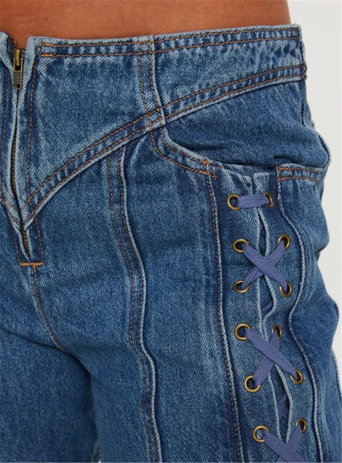 New Low Waist Hollow Lace-up Wide-leg Jeans For Women