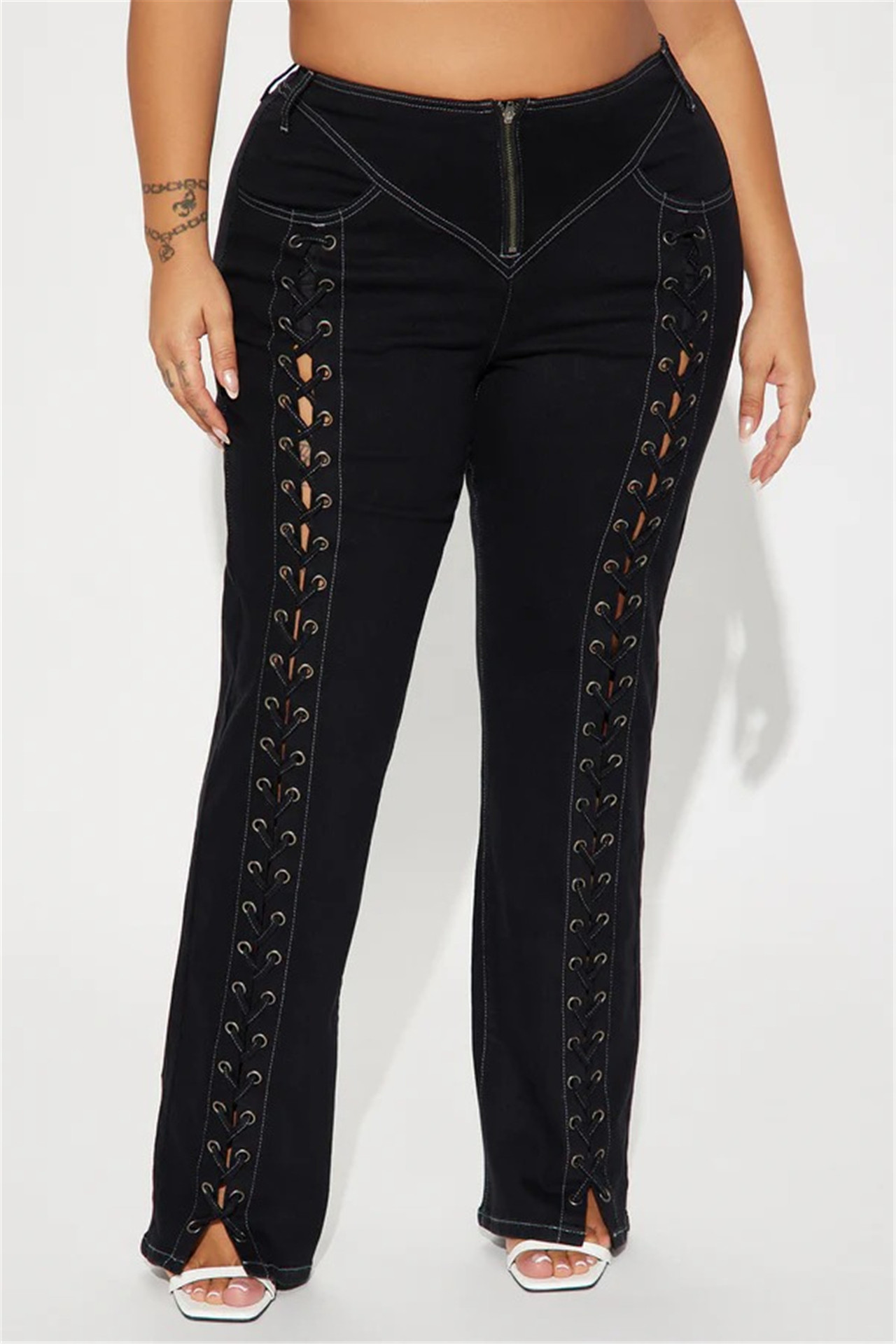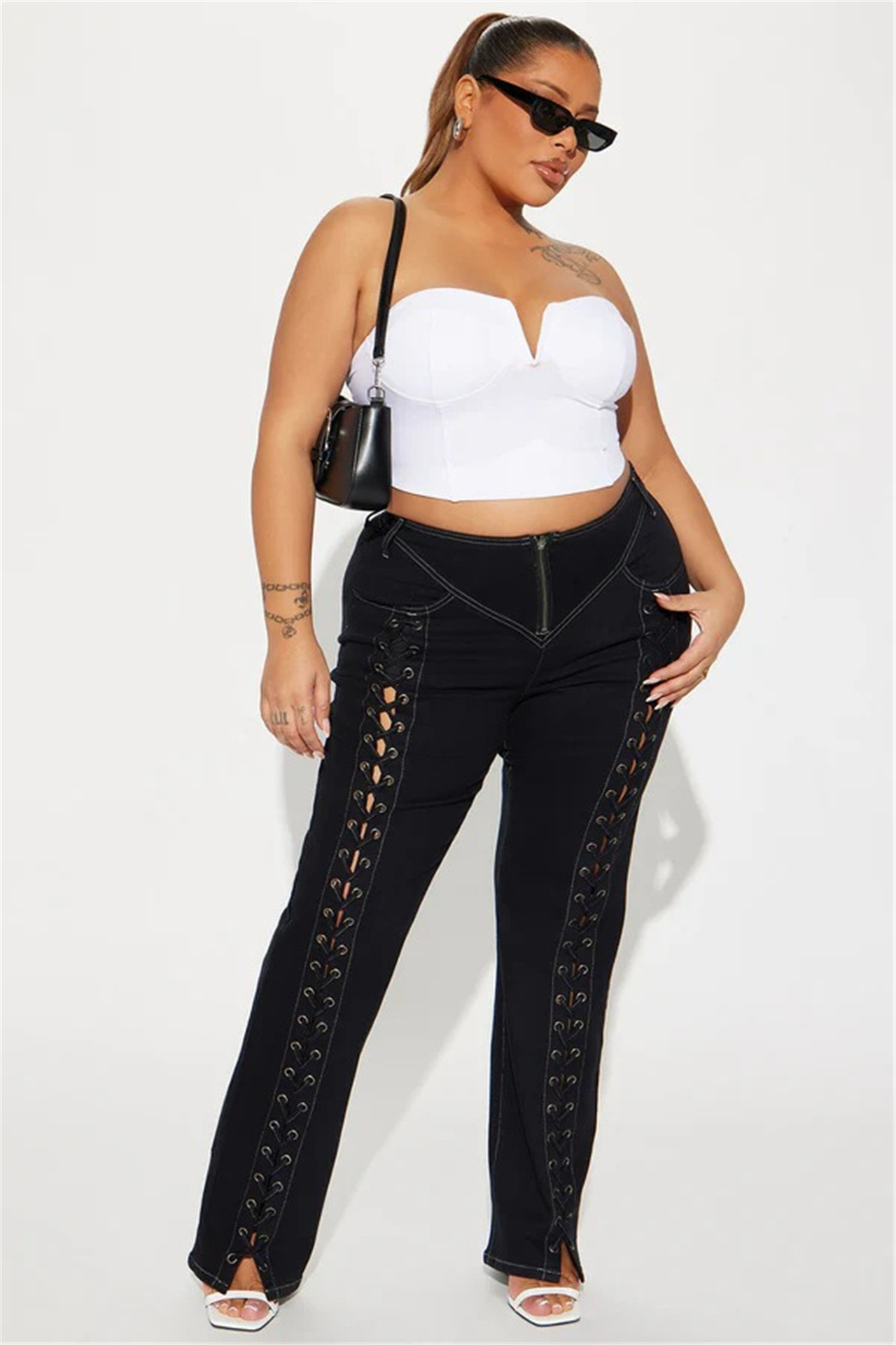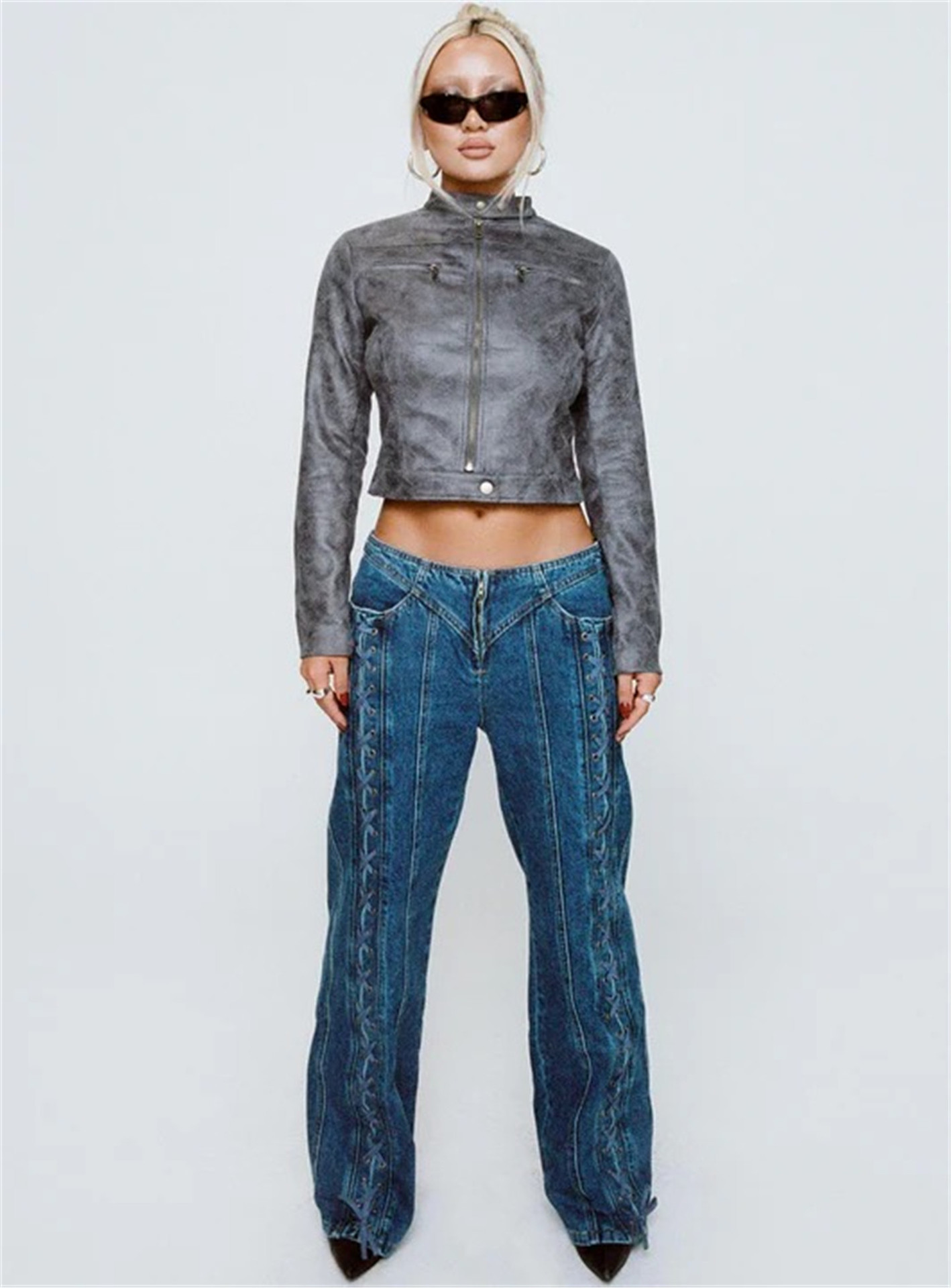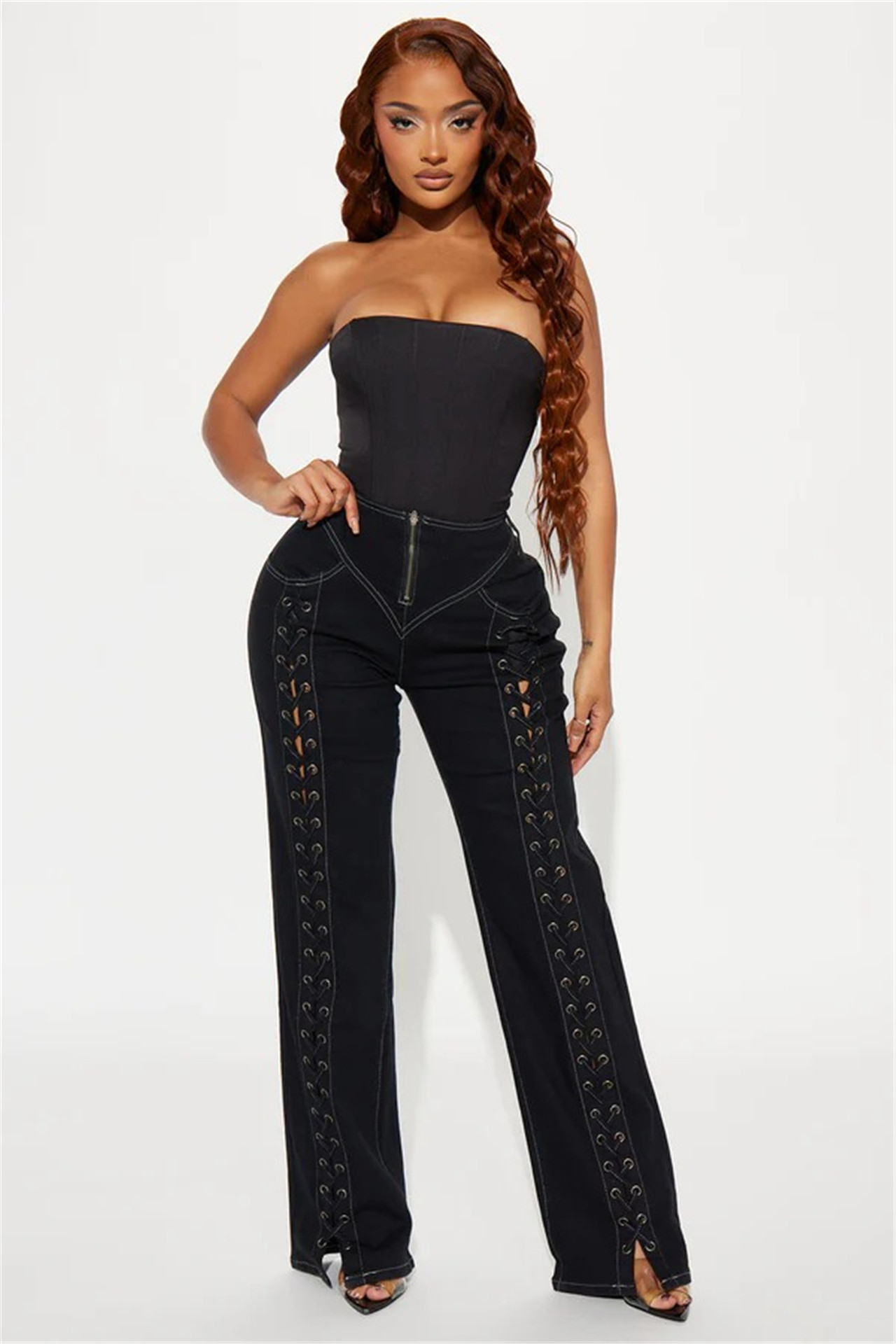 New Low Waist Hollow Lace-up Wide-leg Jeans For Women